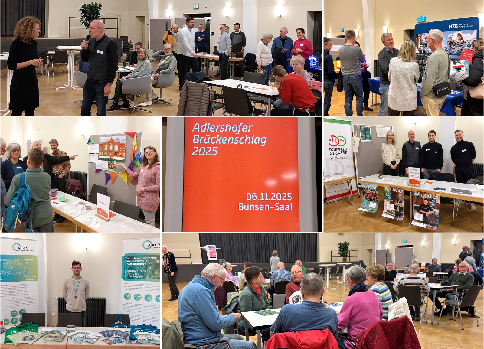 Auch in diesem Jahr informierte der „Adlershofer Brückenschlag“ wieder viele Interessierten darüber, was sich dies- und jenseits des Adlergestells getan hat. Der Einladung zum Nachbarschafts-Infoabend von WISTA Management, WISTA.Plan und dem Team „Lebendige Zentren und Quartiere“ (LZQ) Dörpfeldstraße folgten am 06.11.2025 interessierte alte und neue Adlershofer:innen in den WISTA-Bunsen-Saal.